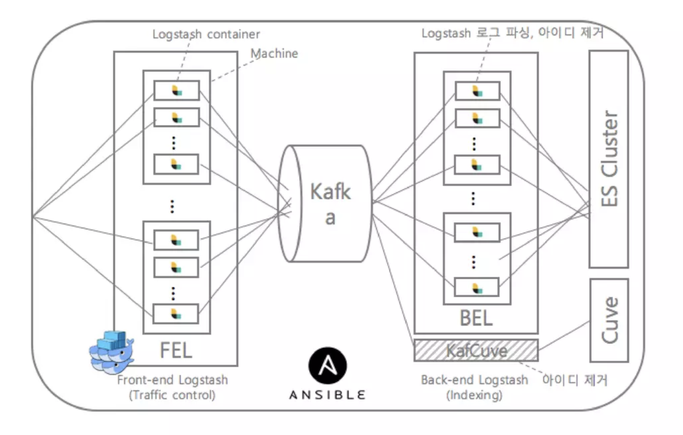 - 앞쪽 logstash들이 클라이언트에서 수집된 로그를 처리 (다양한 프로토콜 및 트레픽을 처리하기 위한 분산처리)