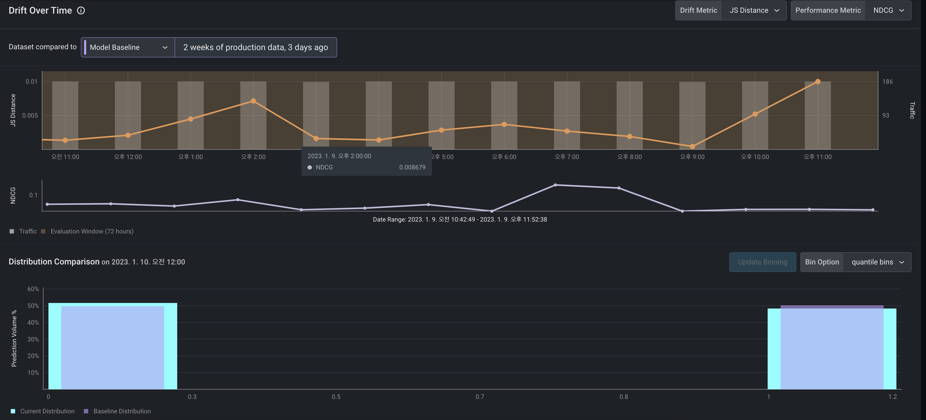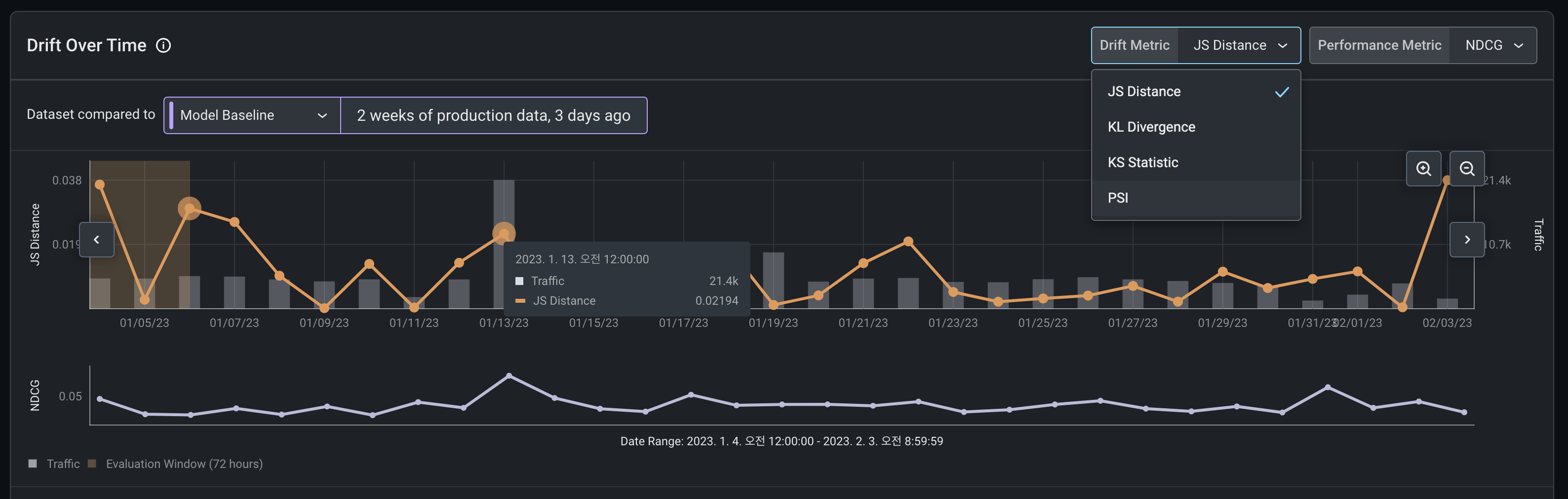 오른쪽 상단의 drift metric에서 위에서 알아본 학습데이터-예측데이터 비교 지표 방식을 선택할 수 있다.